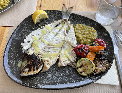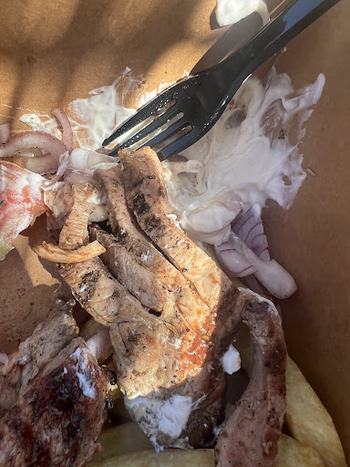 When we tried to order some sandwiches from the menu we were told that those were only served at the beach during the morning, and not anymore so we needed to go to the taverna and could order to take away. Both my (Greek) boyfriend and I ordered the pork gyros. Imagine our surprise when we opened the take out boxes back at the beach and found what is on the picture I included: a piece of pork poorly cut that is clearly not gyros.