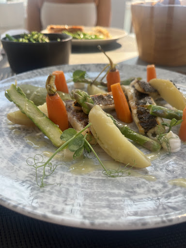 My partner had the sea Bass with mixed vegetables. The zucchini were cleverly placed upright in mini columns using the puree as 'glue.' Yep, that asinine. You can find a better place to eat in Mykanos just about anywhere, e.g. Kastro...