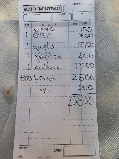 Since they don’t have any menu or prices, we ask about the price of fried red mullet dish, the owners replay “No worries only 7 Euros “when we got the bills we were charged 28 Euros only for small plate of the fried red mullet and 58 Euros a poor meal for two persons. (see bill...