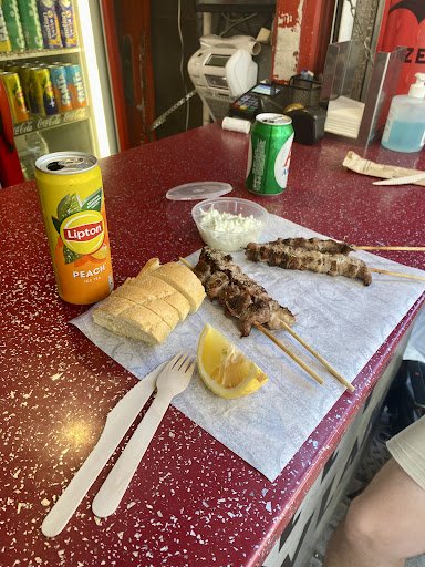 Dana ve domuz vb. gibi farklı et türlerinden yapılan minik şiş kebaplar 1.5 Euro’dan başlıyor. Cacıki de var ama Türkiye’de alıştığımızdan daha yoğun kıvamlı. Mekan temizdi, siparişleri hazırlayan tek kişi hem ilgili hem de hızlıydı. Şişleri tabak yerine paket kağıdı üzerine koyarak servis etti, yanında verdiği ekmekler çok tazeydi.