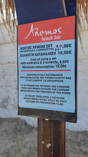 Read moreJust stay away if you value money and yourself above all. What a horeible place on an average,dirty beach. They want to charge you for a sunbed 19:00 plus consumption minimum 10 euro. The most ridiculous thing i've heard. Not even in the most lavish islands like Santorini and the best island beach bars do they charge you after 17:00-18:00. Hope they go bankrupt because of...