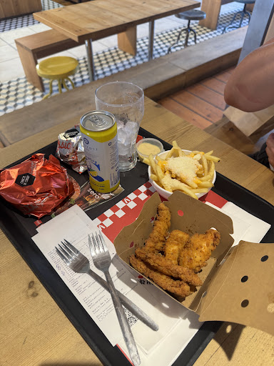 The fries were cold. The burger was weird and had way too much sauce. The fried chicken burger patty was too small for the bun.