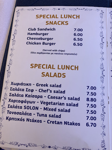 I had dinner at Solon Restaurant while i was holidaying at Tolo September 2019. I ordered stuffed vegies. The waiter didn't tell me that the food was not cooked on the day even when I asked for "vegetable traditional dish of the day". He only told me later that, if I want something fresh I should have order meat. The waiter apparenlty has advised me "not to ask if the dish is "today's dish" as you don't know what you are going to "be served" in other words you are "lucky" you speak the language.. that what It came out of his mouth. I found this unprofessional and opportunistic behaviour which the management should take notice and train its staff, If you are local you are looked after if you are a tourist you eat @@@ I would never return to...