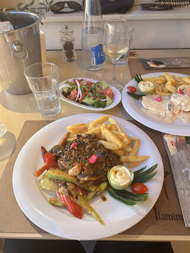 Read moreThe Flamingo Restaurant and Bar are for you if you want Greek music and dancing, and plates shattering. The musicians are very good. While this is all good fun, the staff, unfortunately, are a major disappointment and put a damper on what we hoped would be a fun evening. Upon arriving for our reservation, we were asked to wait. This wasn't a big deal, but then after we passed two empty tables they seated us against the musicians amongst the shattering plates. Sitting at this table would mean people would be breaking plates with shards flying while we're eating. We asked to be moved to one of the other open tables, but they claimed they were reserved. At the other table we asked for, they seated a couple who requested and was moved to a different table and we're obliged. Then they seated another couple who also requested and was seated at an alternate table. Finally, they allowed us to move there. Then they moved our original table, connecting it to another making my friend and the guest at that table basically sit on top of each other blocking the walkway for waiters and other diners. When our appetizer came out, we didn't know the waiter came up behind us, he shoved it between us, hitting my friend in the face with the plate. The appetizer of fried zucchini and eggplant were undercooked and soggy. For dinner I had the pork tenderloin, which was ok. My friend had the grilled calamari, which she said was delicious. Overall, as I said, this could have been a fun experience, but the...