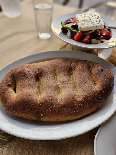 Garlic bread was great. Tzatziki was one of the best we've had in all of Greece. Greek salad was lacking flavor.