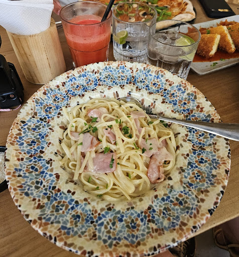 We had a not so great dinner experience at Hug Me Naxos. The manager (?) out front was super friendly, explaining the menu, and not pushy at all. We decided to eat because he was so genuinely hospitable! We ordered 2 dishes at 7:44, and received one dish, the pizza, exactly 11 minutes later! We were impressed by the fast service and the picante pizza was nice…it had a sweet sauce and a little heat. The issue with our meal was that my wife’s dish did not arrive until 8:20, 25 minutes after my pizza arrived. I’m sure it was a mishap in the kitchen, where the dish was just forgotten. Due to the long wait, we ended up sharing a few slices of the pizza and the rest got cold while we waited. We then shared her pasta when it finally arrived and took the rest of the cold pizza home. There was not explanation for the late arrival of her dish, but we did explain at the end that we were disappointed. The waitress was apologetic for the mistake and did bring us a couple complimentary yogurts with walnuts and honey as a result. I would possibly suggest a 2nd person on the floor, cleaning dishes away AND taking card payments to help speed up departures. That would be more efficient and free up tables quicker for more business. As far as the pasta dish, the meatballs were very dry and lacked flavour (and were a little pink inside), but the pasta sauce was lovely! I would return here to try their brunch, which looks and sounds great, however our experience last night was definitely not a highlight of our time in...