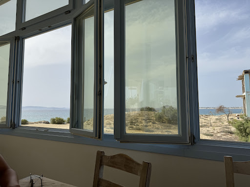 Read moreWent here for the views but we went late afternoon so the sun was still burning hot. The restaurant had the sun shades covering the views but we were able to get the views via the windowsâ which was actually our preference because it was too hot to be in the sun and they didnât have any outdoor fans. This would be a wonderful place to get the views. They brought out a bread basket and a green sauce to put with it. Bread baskets in Naxos are not complimentary like what we would have in the US; weâve generally seen the cost to be between 1.5 - 2 euros per person at the table and we noticed that the restaurants in Naxos donât ask you first whether you want the bread. If you donât want the bread, better to tell them as they bring it out otherwise you will be charged. The Saganaki was delicious and would recommend getting it. The gastras pork was a little dry and tough, but the sauce was delicious and I liked the contrast with the figs. The rest of the family thought their dishes were plain tasting. Service was quick...