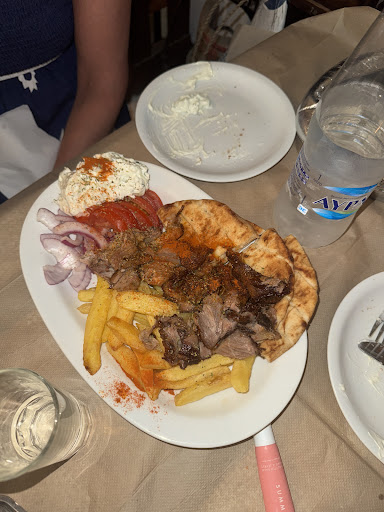 Even the fried potatoes/fries, which are usually very tasty in Greece, were tasteless and underseasoned on top. I suspect the fries are frozen and store-bought, as is the tzatziki (you can tell by the rather plain taste und watery texture; also, no olive as a garnish) and apparently the pita as well.