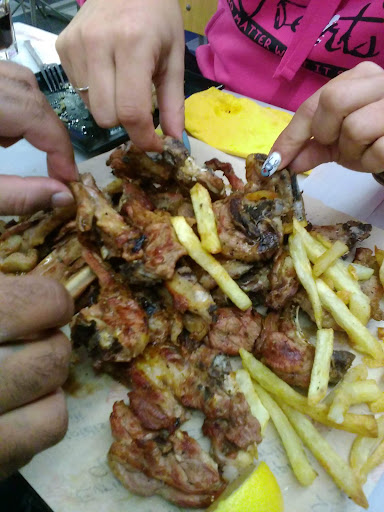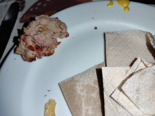 Τα τρώμε όλα αυτά, τελειώνουμε και όσο περιμένουμε να χορτάσουμε, από την άκρη του ματιού μου - που είμαι δίπλα στο τζαμί υπενθυμίζω - διαπιστώνω το μάγειρα να πιάνει τα κρέατα με το γυμνό του χέρι. Και ήτανε πολλά κρέατα μαζί, ένα λουκάνικο μία μπριζόλα και άλλα κρέατα όλα σε μία χούφτα, τα έπιασε από μέσα από το δοχείο και αυτό το είδα πεντακάθαρα κάτω από τη σούβλα που ήτανε - οι μάγειρες που διαβάζουν αυτό εδώ ξέρουν ακριβώς μπορώ να σας πω κιόλας σε ποιο δοχείο ήτανε, το κάτω αριστερά από τη μεριά της κουζίνας σαν να λέμε κάτω από τη σούβλα το πιο κάτω αριστερά. - με το που το διαπιστώνω αυτό μέχρι να φύγουμε παρατηρώ κάθε κίνησή μέσα για το τι γίνεται μες στην κουζίνα. Η κοπέλα με τους κρίκους στα αυτιά ( η ξανθιά ) δεν φορούσε ούτε ένα γάντι, έπιανε όλες τις πίτες με τα γυμνά της χέρια και όλοι οι υπόλοιποι μάγειρες φορούσαν ένα γάντι μόνο ή και κανένα.