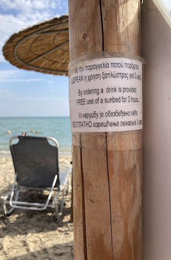 Read moreCaution with this bar because you can find your stuff removed from the sunbeds you have paid for. All beach bars in Nea Kalikratia provide sunbeds the customer can use the whole day for certain price. This beach bar is an exception. We paid for our sunbeds and drinks but our towels were removed while we were having lunch in the same bar. We returned after 30 min just to see that our sundbeds were taken by other people and our stuff displaced, although there were plenty free sunbeds. The explanation by the waiter was that they thought we left 😂( and we left our stuff, yeah right) and when i wanted to talk with the responsible person, the bartender was identified as the manager there :). His reply was - that is our policy… i asked what if we were swimming for 30 min, would they remove our towels ? Then you have silence, no answer. In general, very infantile behavior of the staff and ,,the manager’’ The waiter gave our sunbeds to his friends.Instead of apologies they find ridiculous excuses and claim that is their policy and offer another sunbeds (if that is the policy why are you offering another sunbeds?)All other beach bars in Nea Kalikratia are great...