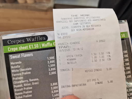 Read moreΘετικά : παρα πολύ καλή κρέπα , φρέσκα υλικά , μεγάλες κ πολύ καλά ψημένη κ ΕΠΙΤΕΛΟΥΣ ένας που ξέρει να τυλίγει την κρέπα ώστε να μην τρέχουν οι μερεντες από κατω κ αρχίσεις το γλύψιμο κοιτώντας δεξιά κ αριστερά μην σε δει κανένας . Αρνητικά self service , τιμη 4 κρέπες τις πληρώσαμε κοντα στα 20 ευρώ , όταν η κρέπα εινσι έτοιμη σε φωνάζουν από μέσα να πας να την πάρεις , οποτε σε αυτή την περίπτωση πρέπει να έχεις το νου σου κ υπάρχει πιθανότητα να γίνει λάθος κ να πάρεις την κρέπα άλλου . Σύνοψη θα ξανά...