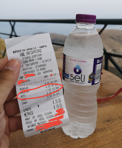 Είναι self service, που σημαίνει παίρνεις το προϊόν και φεύγεις — ή κάθεσαι, αν θέλεις. Οι τιμές όλων των προϊόντων είναι περίπου 70% ακριβότερες απ’ ό,τι στην υπόλοιπη Κέρκυρα. Χαρακτηριστικά θα μιλήσω για το εμφιαλωμένο νερό 500 ml, το οποίο σύμφωνα με την Υπουργική Απόφαση Α2-861/2013, που καθορίζει τις ανώτατες τιμές διάθεσης συγκεκριμένων ειδών σε χώρους μαζικής συνάθροισης (όπως μοναστήρια, αρχαιολογικοί χώροι, λιμάνια κ.λπ.), δεν πρέπει να υπερβαίνει τα 0,50 €.