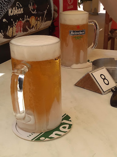 This is a lovely little cafe, right on the beach front and has sunbeds for customers. The food is simple fast food at very reasonable prices, as are the drinks and ice creams. The cafe is at the back of an arcade that has loads of video games some of which are on big screens, the arcade is on the main road so you have to walk through to the cafe. This year it's all a bit new as a refurbishment was done after last year's season, the toilets are excellent and kept clean. Food is served...