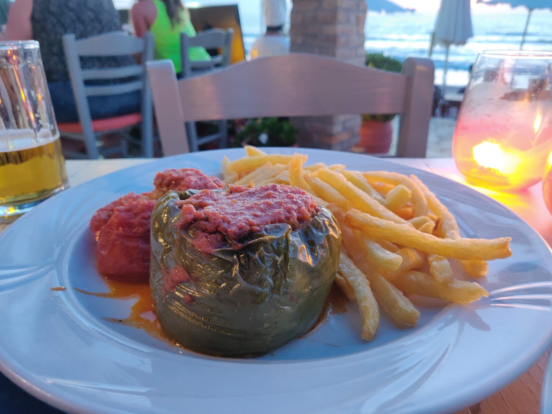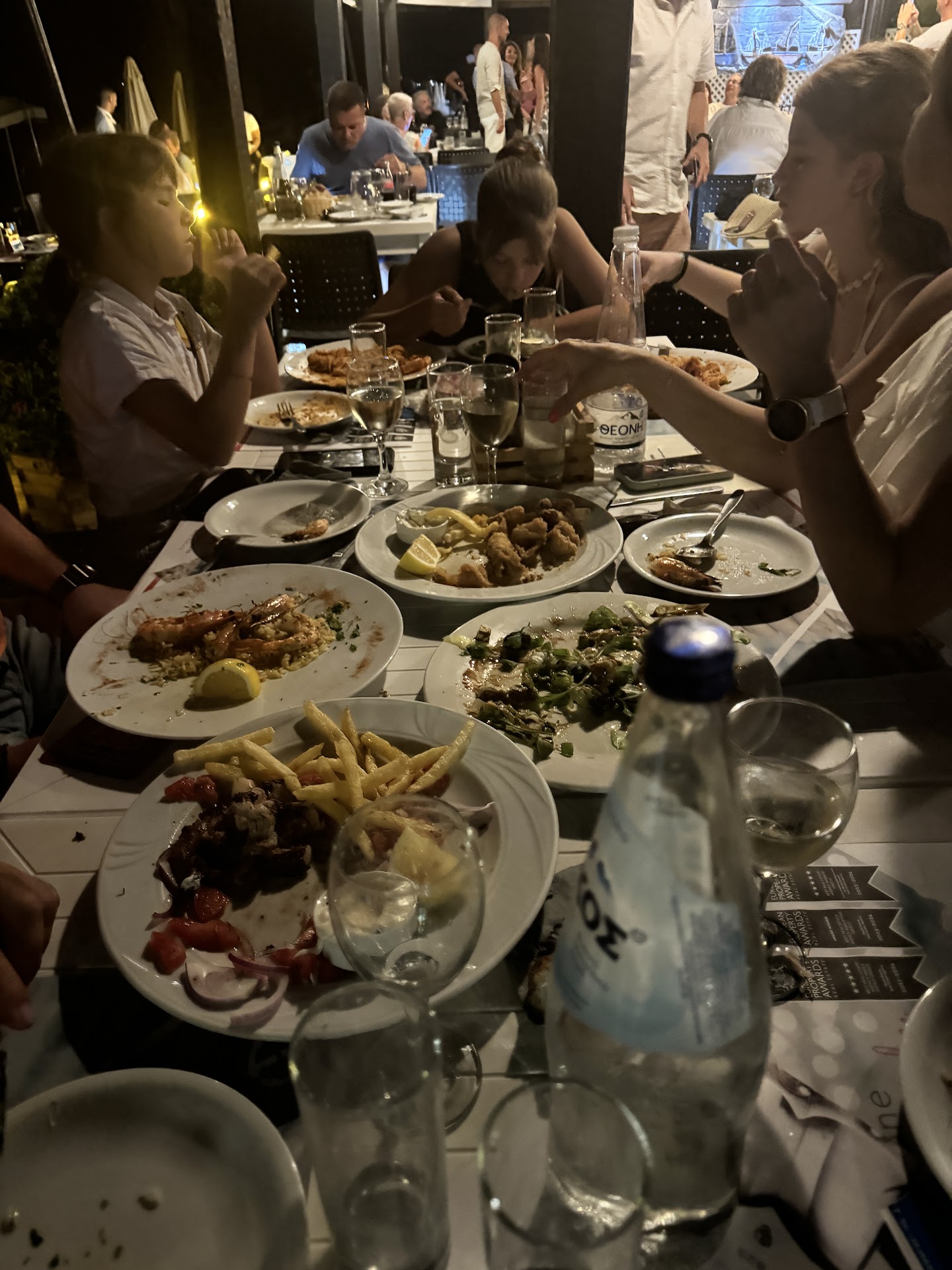 Read moreWent at 20:00, table stayed empty of food until 22:20, and so did those of the people around us. Its ok to distract us with loud music and dance for some time but 2 hours is insane especially since we ordered plain spaghetti with some frozen fried calamari and whatnot. Atleast the salads came. If youve been to greece a lot the food will not surprise you - rice was dry, shrimp’s intestines werent cleaned out. Restaurant is packed yet service is unbelievably slow. Wont come again and i advise you not to come either - at least not during active dinner hours. For reference on my pictures you see the food has come when it was pitch dark outside and we came well before sunset. Only positive really is that its by the beach and theres lots of tourists. Also the band was great and very talented, playing traditional greek music and more - they surely managed to entertain us for some time