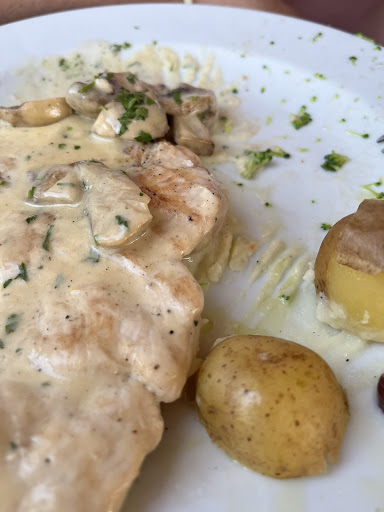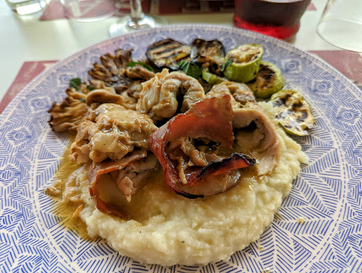 Today I had the Bruscetta (a mortadella, a roasted aubergine, a tomato and a melted cheese (all shared)) and my main was the chicken thighs stuffed with cream cheese and wrapped in Parma. This was served with shitake mushrooms, grilled courgettes, grilled aubergine and a creamy mash with a mustard gravy.