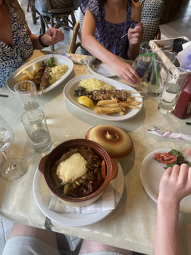 I had a casserole dish (I forget the name now!) with beef, vegetables and potatoes in a tomato sauce - it was lovely, the family had souvlaki. House wine was good and the deserts were very tasty - Kumquat cheesecake and warm brownie with icecream.