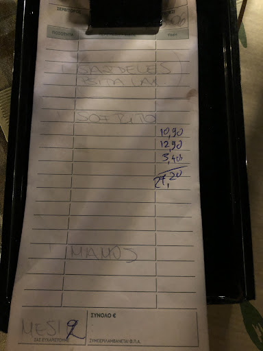 Read moreQuite possibly the worst meal I have had in Greece, and I’ve been coming to Greece every year since 2008. Great service from the young male waiter who sat me down. However my order was taken by a completely disinterested waitress. I ordered sardines and sofrito. I was given a complimentary starter comprising a piece of flatbread (fantastic 9/10) and stew (very good 7/10). It went downhill from there. Sardines were deep fried, and over salted. Things you do when your fish is less than fresh. (4/10) Sofrito was TERRIBLE (1/10). Sauce was runny and lacking in depth of flavour. Rice was a soggy mess. Only getting the single point because the fries were pretty good. Meat was tough as old boots. I ate maybe 1/10th of the meat and asked for my plate to be removed and for the bill. Disinterested waitress asked why and I told her. She gave me a courtesy “sorry”. After 20mins I had to remind the waitress for my bill and she promised to get the card machine but never returned. Cue young male waiter who brought card machine and I paid the full bill. I gave him some honest feedback and he was shocked. He was genuinely apologetic and asked why I didn’t say something before paying the full bill. I told him I wasn’t after a free meal and explained that I informed the waitress but she was indifferent and gave me the full bill anyway. I won’t...