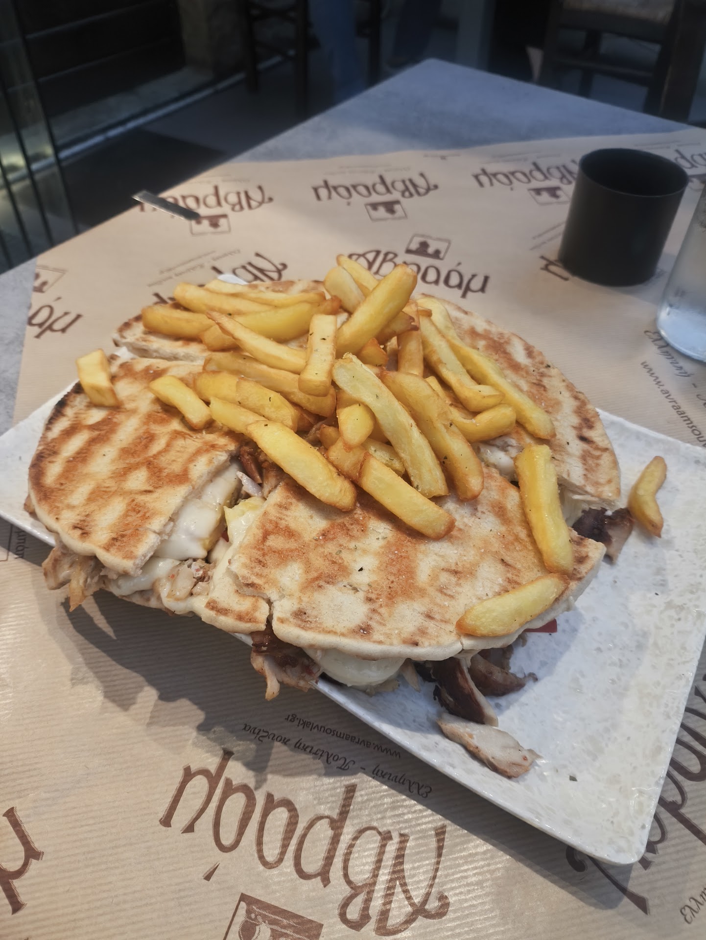 We were happy to find something open when the other tavernas nearby were all closed on a Saturday evening (apparently this is common in this area). We asked if someone spoke English and a man helped translate the options for us. He was very helpful. We had the gyros with pork and the plate portion with kebab (lamb mince). It was all delicious!! The serving size was excellent value for money. Cheap beers too. The waitress seemed a little bit annoyed that we had ordered inside and sat down (not take away). Just a cultural differences for Aussies I guess. They are big on table service here.... Chips were a little bit cool. But the meat, pita and tzatziki were all absolutely primo 👌🤤 wish I could eat this...