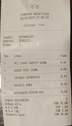 Πήραμε κρασί ροζέ 250 ml , μπύρα βαρέλι 500ml (μπορεί να κάνω λάθος, αλλά δε μου φάνηκε το ποτήρι για 500ml), πικάντικο λουκάνικο, πατάτες baby με μανιτάρια, τηγανιά κοτόπουλου με πιπεριές και ψωμί (εάν δε το ζητήσεις δε σου το φέρνουν). Πληρώσαμε 30€.