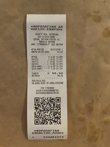 One star is too much! I asked for scallops as an appetizer, 3 of which were ok, the rest were too dry, that is, they were either of poor quality or reheated! Along with the clams, they also started bringing the second course/serving education 0!! The squid ordered at the grill was RAW!!! They brought to the table from the beginning bread & water that were not ordered! When we asked for the payment note, they told us that the bill was 49.50e without receiving the receipt! ...After 15 minutes/and asking for the bill 3 times, they brought us the receipt very angry!!! The receipt included bread and water, which I did not drink! The waitress being very indignant stated that in Greece it is something normal! The quality of the food is disastrous, the service as well, the only positive thing: the...