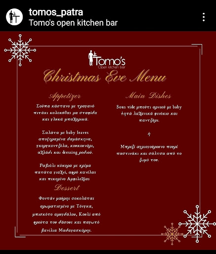 Read moreI have eaten at Tomo's Open Kitchen many times and each time the food and menu has something even more delicious than the last time. Christmas eve dinner was a fixed menu consisting of a soup, a salad, ravioli and a choice out of 2 main courses... Lamb or wild boar. I had the lamb and my wife the wild boar.. And then we swapped plates so I got to taste both..... WOW!!!!! Absolutely delicious, a gastronomic explosion. If you live in Patras Greece or travel to Patras then definitely consider...