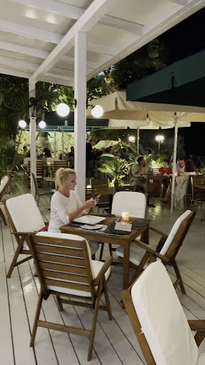 The atmosphere is very enjoyable, decent music with views of Lakka's wonderful setting. The layout of the tables and seating is comfortable. We were greeted and made feel welcome.