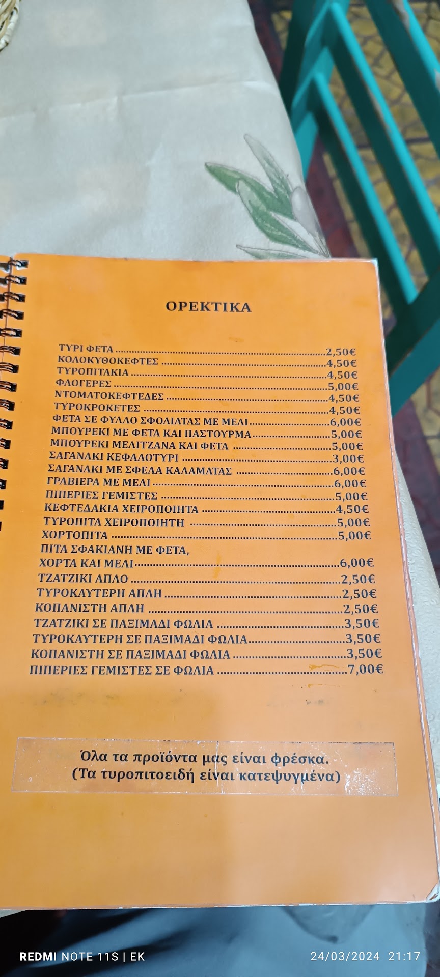 Read moreΕπισκεφτήκαμε οικογενειακώς το μαγαζί Κυριακή αργά μετά τις 15.30. Η εμπειρία μας ήταν κατώτερη των περιγραφών που αναφέρονται στις αξιολογήσεις. Ξεκινάμε λοιπόν, αρνίσια παϊδάκια αδιάφορα και άνοστα, μπιφτέκι γεμιστό άνοστο και καμμένο από την μια πλευρά. Κολοκυθοκεφτέδες σκληροί απ' έξω και σχεδόν καμμένοι. Απαράδεκτο. Το μπουρέκι με γέμιση παστουρμά αδιάφορο και αυτό .Το λουκάνικο κλασικό που το βρίσκεις στο σουπερμάρκετ. Καλαμάκια χοιρινά δεν δοκίμασα αλλά από τα τρία τεμάχια της μερίδας το παιδί έφαγε μόνο το ένα. Νόμιζα ότι τα σφολιατοειδή ορεκτικά ήταν σπιτικά αλλά όλα ήταν κατεψυγμενα και όχι σπιτικά. Τα λουκάνικα συσκευασμένα όπως τα βρίσκεις και στα σουπερμάρκετ. Μόνο οι τηγανιτές πατάτες ήταν οκ. Και ο λογαριασμός στο τέλος δεν το λες και οικονομικό το μαγαζί. Επίσης,γλυκό στο τέλος εμάς δεν μας έφεραν. Φάουλ εδώ. Τα συμπεράσματα δικά σας. Πάντως ίσως θα δώσουμε ακόμη μια ευκαιρία στο μαγαζί γιατί μπορεί να πέσαμε σε δυσκολη μέρα. Θα δοκιμάσουμε διαφορετικά πιάτα. Σε τέτοιο μαγαζί περιμένεις να φας σπιτικά και χειροποιητα μεζεδάκια και όχι ετοιματζίδικα και...