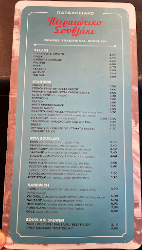 Read moreΤο καλό φαγητό συνοδεύεται και από το ανάλογο συναίσθημα. Το καταλαβαίνεις όταν το ζεις. Και εδώ έχουμε ένα μαγαζί που έχει όλα τα στοιχεία για να σε οδηγήσει στην απόλαυση. Πειραιώτικο σουβλάκι, στο κέντρο της πόλης, σε ένα όμορφο και σκιερό μέρος, το οποίο βγάζει παράδοση. Το καταλαβαίνεις από τις καρέκλες παλιού καφενείου, από τις ευγενικές φυσιογνωμίες των κυρίων που παίρνουν παραγγελία ή φέρνουν τα πιάτα (άνθρωποι που η ηλικία τους δείχνει και την πείρα που κουβαλάνε), κυρίως όμως από το σουβλάκι! Ένα σουβλάκι όπως το ήξερες και όπως το θέλεις, ελληνικές γεύσεις χαμένες στο χρόνο... Και αυτό φαίνεται παντού.... Στην παραδοσιακά ψημένη πίτα, στις πατάτες που είναι κομμένες στο χέρι και απίστευτα εύγευστες, στα υλικά που χρησιμοποιούν για να γαρνίρουν... Με την πρώτη μπουκιά χάνεις την αίσθηση και νιώθεις ότι βρίσκεσαι πολλά χρόνια πίσω. Με 10 ως 15€ το άτομο καί τρως και το ευχαριστιέσαι. Να είναι καλά οι άνθρωποι και να μας ταΐζουν για πολλά...