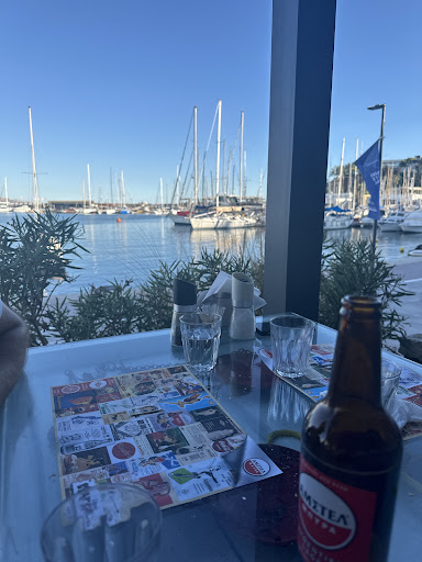 We had lunch at 1.30. Me, my wife, and three kids aged 8, 5, 5. Disregard our review if you are a young couple with no kids. We ordered fried feta with honey and sesame (good), grilled sardines (good but just six tiny fishes), greek salad (mediocre tomatoes, not particularly good), pork bites with interesting sauce (so-so, my wife actively disliked this) chicken nuggets for the kids (good for being chicken nuggets) and steamed mussels (ok). Basically the food is “standard international bistrot experience” level. My son asked for “soda” and he got a club soda bottle, that is strongly carbonated water. Perhaps this is a language barrier issue. We would have liked to have coffee at the end (either greek coffee or frappé) but they said “only espresso, we do not have milk”. Again perhaps this is a cultural barrier thing like ordering cappuccino after lunch in Italy? I will ask chatgpt about that. The table is made of glass and in front of each of us there were two glasses (wine/water). Taking away the wine glasses from the kids would have helped reduce the risk of a disaster (piling them up and having them fall on the glass table seemed fun to them). There are very young waiters that are given no leeway in taking decisions so they always have to ask their seniors even for seemingly trivial stuff, making the whole process slow and somewhat awkward. The view is...