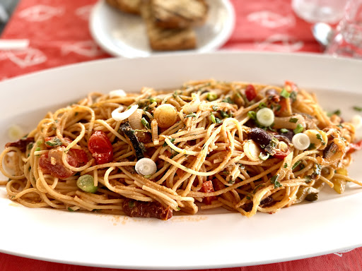 Eva, the chef, was very accommodating for my vegan diet. Some vegan and vegetarian choices on the menu, with generous portions. Most of the vegan dishes pictured here were made especially for me, and not on the regular menu, which features, primarily, a lot of traditional Greek fish dishes. I chose vegan spaghetti, custom made for me, with olive oil, fresh tomatoes and sun-dried tomatoes, mushrooms, olives, peppers, onions, sprinkled with chopped, fresh scallions on top. This dish was flavorful, and had enough food to take home leftovers. Next time I’ll try the eggplant with tahini sauce which sounds great. Sparus restaurant is a friendly, casual, welcoming, peaceful place, reasonably priced, across the street from the sea, with fresh breezes, and shady, outdoor seating, overlooking the passing sailboats. Friendly to solo guests. Additional to my review: I spent a considerable amount of time in Piraeus and kept returning to Sparus Restaurant. Chef Eva created delightful, delicious and consistently creative, and different special vegan dishes for me, with each visit. I couldn’t ask for better food while in Piraeus, on my visit. One day we collaborated on making stuffed grape leaves and Chef Eva demonstrated some Greek recipes for me, all made vegan, especially, including vegan moussaka, a vegetable soup, a salad, and a dessert. I’ve added a number of my photos, taken of a variety of dishes I enjoyed at Sparus Restaurant since I first wrote my review. All photos copyright: Joyce Glasgow,...