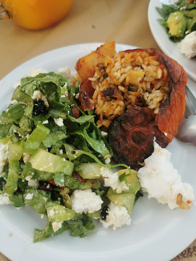 Oh my gosh, this place is just amazing! We came here randomly as we were coming from from a long day trip around mountains. We wanted to snack on something light so we only got salad (i can't remember which one it was unfortunately) and stuffed peppers. Their menu was much bigger than that. Not everything was available which makes me believe everything they do is fresh. Prices are on a cheaper side, the restaurant is super cute and beautifully surrounded with various plants/flowers. Food was just amazing! It tasted like it was done by one of those grannies that you love having dinners at. The guy that served us was so friendly and polite. We were extremely glad we ended up in that place. I wish they will always have guests, highly...
