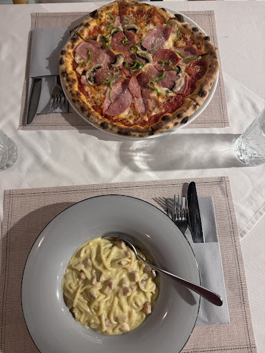 To be fair, we may have been there a bit too early for their liking. We got there right when the restaurant opened and were the only ones for a solid 20 minutes or so. I'm not sure if it was more of a surprise or annoyance for the staff, but the menus were delivered "by air." The menus were here and there on the table, and it was our duty to sort them out after their little flying session. We didn't even have time to start reading those menus when we were already asked/demanded to order. When we couldn't say anything yet, we were met with a long and loud sigh. When we were ready, we were ignored for a while, even though we were the only ones, and a bunch of the staff members were sitting on the table next to us. Half of the stuff in the menus could not be ordered. One member of our party didn't eat red meat, so there was only one option to choose from. Everything else on the menu was met with "we don't have that." I get it that it's not a fast food restartaurant, but almost 40 minutes for a kid's pizza is a bit too much. And it arrived burned. The Mediterranean dish was good and solid. So points for that. The starters were bland, and we didn't try the desert. Overall, something in us made the service staff visibly want us to leave. The only time we were met with eye contact and a smile was...