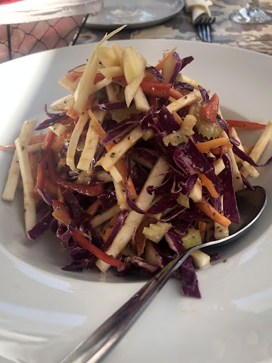 This place has a majestic flavor to it, here you sit under the eucalyptus tree and can see the sea in the back. The staff is very friendly an proactive, they know what they are doing. This restaurant only serves a hand full of dished but everything is made with love, experience and creativity. The salads are setting a new standard and are very complex in flavors, I did not know that a salad could taste that good. The fish was very fresh, cooked perfectly and in general every dish was finger licking.