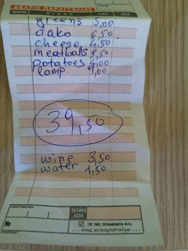After hiking the Samaria Gorge, then driving to Atsipopoulo Village, I let my family relax at our lodging while I went walking in search of some dinner for everyone. First place I came to was O Manolis, where a gentleman sat reading a newspaper in an otherwise empty restaurant. (The entire village was attending a music festival at the local high school.) He greeted me warmly and I asked for some food to go. He had some aromatic lamb stew, savory meatballs, and succulent Greek salad with the most buttery feta I have ever eaten. He made french fries for the kids and poured a liter of chilled, homemade Cretan white wine into a bottle for me to take. He included some freshly baked pita and little tasty morsels of dessert. Charged me Euro 25 for the entire feast.