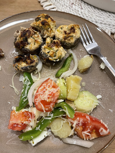 Read moreWe walked up because his listing doesn’t say delivery, but he does deliver to certain areas. Greek salad is hearty with the potatoes. I’m not entirely sure what’s in the stuffed mushrooms but they have a marinated flavor and crumbly cheese, possibly feta, artichokes, and sun-dried tomatoes. Husband says the Carbonara is good. It has thick linguini noodles and thin sliced ham, mushrooms, and leek with a thin cream sauce.