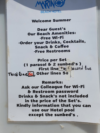 Read moreCaution, the staff on the beach is swindling and trying to take extra money from you. In the information on the beach it is written that the set of sun beds and an umbrella costs 6 euros. The first time (three days ago), a man with a beard demanded 12 euros from us for one set, because we were 4 people, although we asked only one set. And nowhere is not specified that we must pay for the number of people. Today he tried to take extra money for a chair that stood in a set with the sun beds. When I went to look for a manager, a man the bar, began to prove that I have to pay for a chair, since we are three people. They have no information about the cost of the chair or anything about have many people is maximum for a set of sunbeds. When I asked why there isn't written anything about the extra charges, he said that it's not obligated to write about the extra charges that they have. It is very bad service when you come as a client and want to use their sunbeds for 6 euros, and each time there is some sort of charging that isn't written anywhere. This is the only place we have visited that base their price for sunbeds on how many people you are. The real manager of the hotel should be informed how his employees make an...