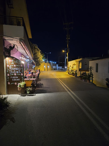 This place is a little gem. The food is delicious, the ambiance/vibe is really cosy and warm, and just generally lovely 😍 We were sat outside where we could just watch the world go by. The village is very calm, and situated atop a hill so the views are generally also very nice. We ate the tzatziki, bread, poppadoms, haloumi, Romeo & Juliet salad, and ribs. Everything we ate was delicious. The salad was so well-balanced and tasty, and the ribs were so tender and so flavourful. At the end of the meal, the owner brought us a little ice cream and locally-made fruit liqueur. The owner is very sweet and nice, and you could tell she loves what she does. There are a lot of stray cats and a couple dogs in the area, and she treats them with such respect and care. Don't be surprised if you get a cat or two sitting near you as they wait for scraps (which the diners are more than happy to provide), though they are very polite cats, and will keep a...