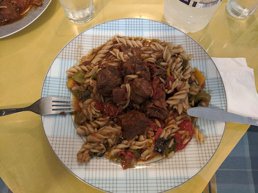 It was very hot outside today, therefore the kids were very agitated. While i was sweating as hell and my wife was stressing me to find a restaurant, i found Stella's Kitchen on Maps. After a little walk, we entered the restaurant. It is nothing extraordinary to look at and there are only a few tables. The owner (I guessed back then) welcomed us, and after washing our table she invited us to make ourselves comfortable. She asked if we wanted something to drink?! As the kids were asking for some fruit juices, she advised them not to drink sweet until the end of the meal. Who would say this, except someone who takes care of his/her guests/clients? Lovely... Then, she offered us to visit the kitchen. She had a few main dishes based on meat: beef, pork, chicken, rabbit, as well as some side dishes: pastas, vegetables, mash potatoes, risotto, etc... We all went for the roast beef and for the side dish: 1 pasta, 1 mash potatoes and 1 risotto. She even makes half portions for kids! It was just delicious. God knows kids can be difficult when it comes to food. But my littlest girl said: , also: . She left me speechless... In the end, we were gifted with two pieces of cake for the kids, as well as a bowl of cherries! I swear the cherries were almost as big as a ping-pong ball! She took care of asking if everything was ok until the end. I couldn't believe the price we paid! I think this must be the best bang for bucks you can get. And I'm not talking about her smile or her joy of living, this is priceless. I wanted to leave a tip, but she politely refused. No need to say we'll be glad to come back if we ever come to Rethymno again.