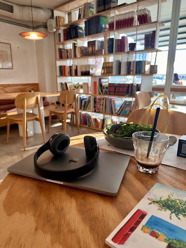 The space is spacious, comfortable, and thoughtfully designed—with plenty of outlets, fresh cold water always offered by the staff, and an artsy, intellectual vibe that makes it feel both inspiring and welcoming. The aesthetic is fantastic: shelves of books, chill music, and a mix of cozy indoor seating (with much-appreciated strong AC) and a relaxed outdoor atmosphere. Upstairs has an even more laid-back feel, perfect for studying or unwinding.