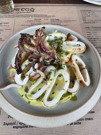 Next up is ‘Grilled squid / saffron sauce’, an interesting combination. I chose ‘French Fries / Herbal ketchup’ as a side dish. The fries are very soggy. The waitress assures me that this is what they do at Amethystos. I only know this consistency from eateries where the fries have been kept warm for too long. The ketchup is delicious, but any interested question about it is ignored. The Septem Mylos Lager turns out to be a pale ale variant and is not at all my cup of tea. The bakhlava for dessert is excellent.