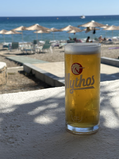 The beach bar is located right by the sea, with a few sunbeds and umbrellas that you can hire at favourable rates. Much cheaper than most other beaches on the island. Great for families, young people and anyone else who wants to spend a chilled day/afternoon on the beach.