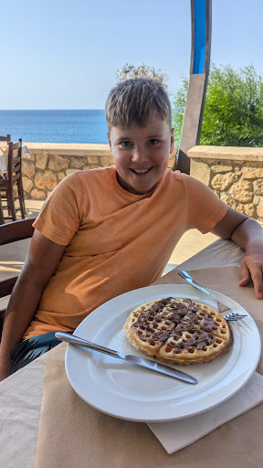 Called in here for breakfast on last day of our holiday and so glad we did! The breakfast was huge and delicious, and the service was amazing. Best of all though was the unexpected discovery that there is a small private cove beneath the cafe, with sunbeds and parasols, and that cafe guests can use it! We stayed there most of the day, and had the beach to ourselves for some of it. It never got busy. Well worth going to the cafe for the use of the beach alone!