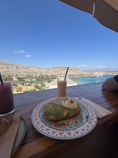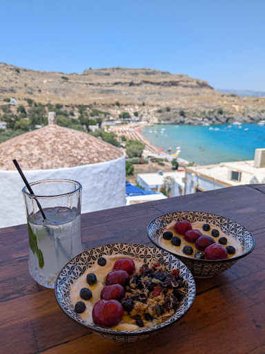 Read moreLovely location on a terrace overlooking the beach, it was easy to find a seat around 1pm on a Sunday even though it's very small. The food was good, but overpriced - probably not an unusual experience in Lindos. We ordered yogurt bowls and for the 9-10€ they cost we'd have expected a larger portion of both yogurt and toppings. Also, the menu says the Special Bowl is meant to come with honey, fruit, nuts and granola, but there were no nuts at all, not even in the granola. The staff member who served us was super helpful with letting us choose what fruit we wanted even though they'd ran out of a lot of their selection - thank you! Also really enjoyed the very refreshing homemade lemonade they serve, wonderful on a...