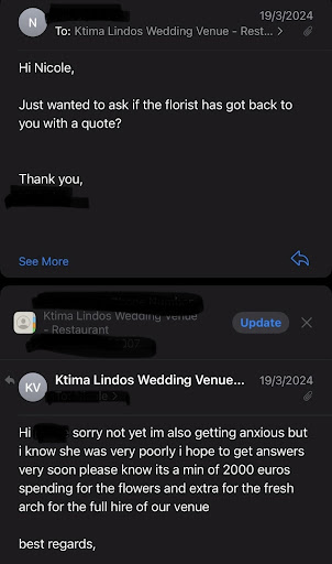 I joined a WhatsApp chat with lots of Lindos brides. The stressed brides were all Ktima brides. All given different quotes, different items were included, over the year then prices crept up, due to one reason or another. EVERY SINGLE KTIMA BRIDE 1 month prior to the wedding had a ridiculous bill with a huge increase in price. This price increase was on EVERYTHING. It was not an extra £100, it was thousands. Some had to get loans from family and banks, some others were stuck. Manolis the owner is fully aware that at this point, you've sent invites, your guests have booked their flights and accommodation. He knows you have no option but to pay the increase in the thousands..... You can't cancel and he will not refund your deposit or the extra fees you've had to pay. He's a horrible money grabbing man, that does not care about anyone but himself. I called him in tears explaining that this wasn't affordable and that cancellation was not an option because he would keep all £20,000 if spent already and that would mean I couldn't afford another wedding. He did not care or help or bend. It was all or nothing.