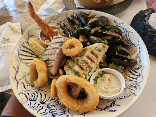 I recently had the pleasure of dining at this incredible restaurant located on the beautiful fine sand beach in Lindos, Greece. The seating arrangement was truly remarkable, as we were seated just a few meters away from the calm waters, practically on the water's edge. The view of the ancient citadel perched on the clifftop was breathtaking and added to the overall ambience of the restaurant.