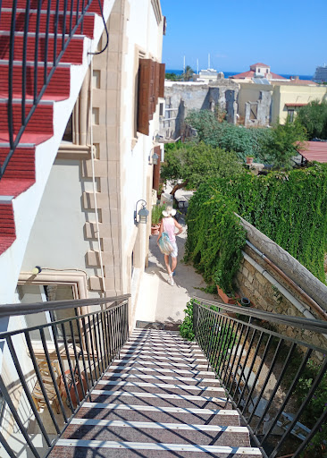 Read moreMy favourite view in Rhodes! If you fancy a break from the busy activity of the old town and you are looking for a peaceful location with a stunning view...here it is! It's just a simple no-frills bar and just serves drinks with a basic food menu. BUT, it has one main outstanding feature - the view. When I first got to the top of those stairs my jaw dropped. From here you can see across the whole of the town including the palace, the harbour and even up to the acropolis (behind you) in the distance. It appears that not many tourists are even aware that this place exists. I cannot recommend this enough! Location: The bar sits over some apartments and is accessible via two flights of stairs (see photo). To find them, walk through the entrance to the apartments. Comments: I have seen one review which moans about the fluttering canopy making a bit of a noise. I think that comment is exremely harsh since this is one of the highest points in Rhodes old town and there is a...