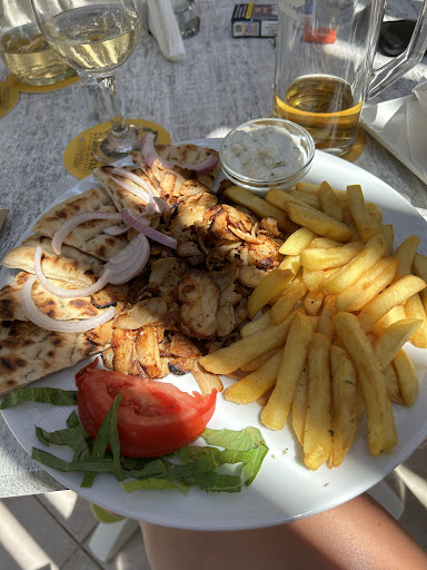 This has been our go to place since staying in the area. We can only speak highly of this place- service is always super friendly with plenty of smiles, the drinks are fantastic, and today was our first time trying food here whilst watching the England final, which was not only great value for money but delicious too. I had the chicken gyros and my husband had a vegetarian burger, we shared a chocolate soufflé. We also shared two jugs of local wine between us (the local wine is a must try it’s absolutely wonderful) and my husband had a mythos pint of lager. Fantastic! We really love this place!...