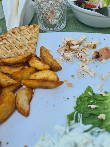 Food: we ordered grilled sea beam and chicken gyros special. The fish was ok, it came with rice and wedges but nothing really special about it. This one was priced around 23 euro and at that price i feel there isnt value for your money. It was ok by any means but nothing extraordinary. The gyros, however, was very poor. In fact, it was not a gyros at all!! It was a grilled chicken breast chopped into pieces, and here they sold it as gyros. I was shocked and utterly disappointed with the meal. I love gyros and this one was very below par. It was so poor that i decided to take a pic to show the chicken breast pieces.