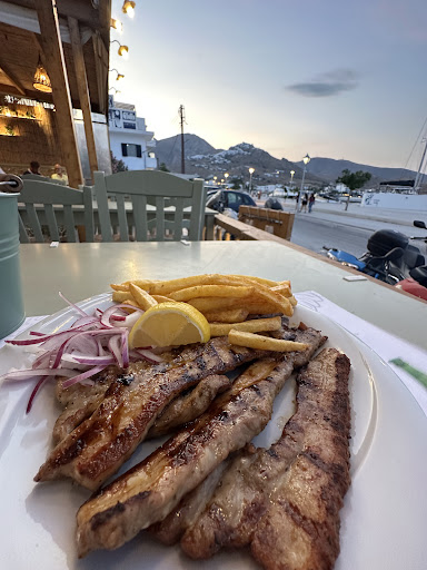 Food was ok but the prices were way and beyond average. We didn't even sit to eat we took our food take away and paid 14.50 euros for 2 pita chicken kalamaki, 2 chicken kalamaki and 2 small bottle of water. We were heading towards our boat leaving, otherwise I would go back and ask for my money. This is tragic to have such prices. A store upper towards the beach called Polyfimos had much...