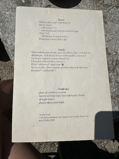 Marvellous location with views over the plain. Artemis andMiranda are very smiley and makes excellent Greek coffee the proper way with a briki. The cakes and pastries that the girls make freshly most days are a real treat, perhaps not too much for the tummy but with cakes like this does it matter? Don’t forget the Sfakian pies made with milzithra cheese and drizzled with local honey! A most pleasant cafe to spend some time. The attached ceramic studio is a gem with all Miranda’s works on display and of course available to buy for that little gift that you promised yourself? What is not...